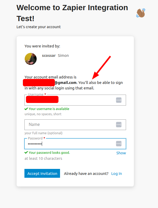 With the username/password signup, users are logged directly into the site when they click the “Accept Invitation” button, so the only friction I can see is that they are forced to enter a password before they can initially access the site.