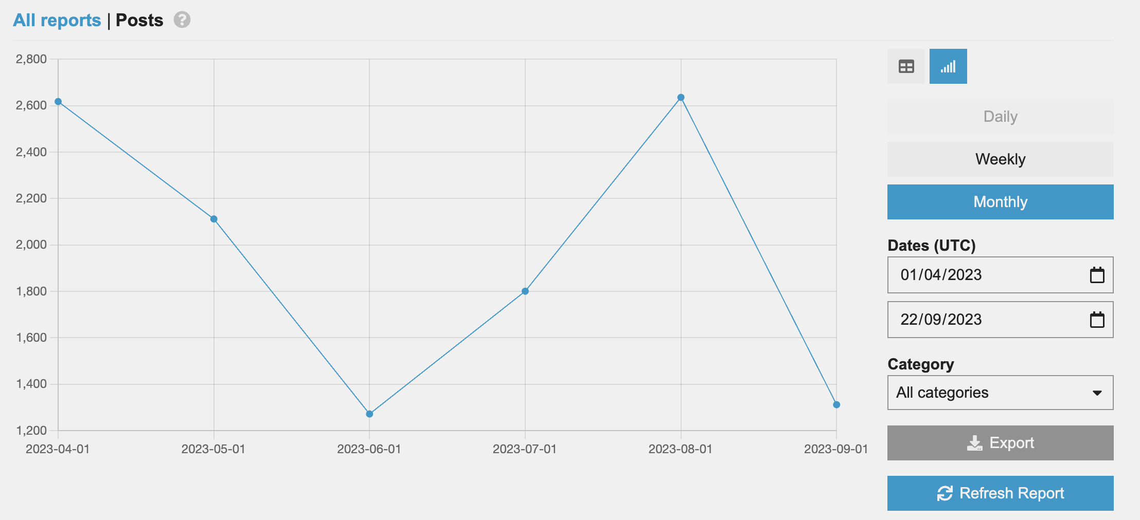 The query only gives you a previous period from the current date. You could either modify it to accept a date range or run it a few times for increasing periods and put the data into a spreadsheet to calculate the monthly stats.