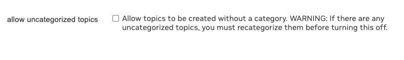 Two highlights, the topics were migrated from an old site, and the “allow uncategorized topics” is checked before (I’m changing it to unchecked). In the site setting there’s a “WARNING: If there are any uncategorized topics, you must recategorize them before turning this off.” does this mean in my site there’re uncategorized topics preventing this setting working?
